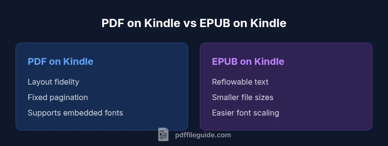 According to PDF File Guide, Kindle devices primarily rely on its native formats (AZW/MOBI/AZW3) for optimal performance, yet they can also display PDFs with some trade-offs. PDFs retain exact page layouts, font embedding, and image placement, which is ideal for manuals, forms, or documents where aesthetics matter. EPUB, by contrast, is designed for reflowable text and adaptive reading experiences. On a Kindle, EPUB does not always render perfectly out of the box and often requires conversion to a Kindle-friendly format. The choice between pdf or epub for kindle depends on how much you value layout fidelity versus on-device readability and adjustability.