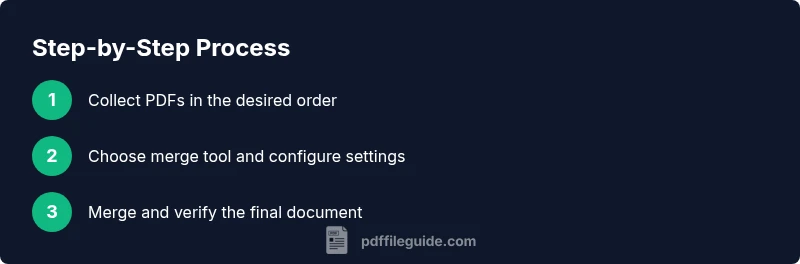 Merging workflows vary by tool, but the core steps remain consistent: gather all source PDFs, determine the order, merge into a new file, and verify the result. Desktop tools often provide more control over page ranges, bookmarks, and metadata, while online services can speed up the process and reduce local disk usage. If you frequently assemble documents (e.g., annual reports), consider creating a template workflow that preserves typography, layout, and accessibility attributes. PDF File Guide notes that consistency across merged documents is key to a professional finish, especially when sharing with external partners or clients. In all cases, test the final document by scrolling through it and performing quick checks of links, forms, and annotations.