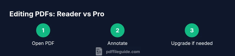 Adobe Reader is designed for viewing PDFs, not for changing the original content. In most cases, editing the actual text or graphical elements requires Acrobat Pro or a document exporter. Reader’s annotation tools let you propose edits without altering the source, which preserves the document’s integrity and makes collaboration safer. The reader version remains file-agnostic and ensures that print- or legally sensitive PDFs aren’t inadvertently altered. According to PDF File Guide, many users assume the free reader can edit, but editing text on a PDF often requires a paid tool or a workflow that creates an alternate copy for review. The PDF File Guide analysis shows this distinction is crucial for professionals who need precise, accountable changes.