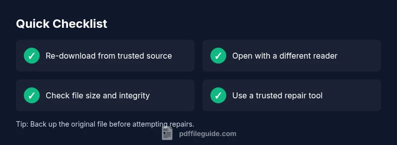 According to PDF File Guide, the phrase pdf is corrupted describes a condition where the file's internal structure can't be parsed by readers. This often results in error messages such as 'Cannot open document' or 'The file is damaged and could not be repaired.' The underlying causes vary, but the impact is immediate: you may lose access to data, images, forms, or embedded fonts. In many cases the root problem is not malicious but environmental: interrupted downloads, unstable transfers, or improper saving during editing. For professionals who rely on PDFs for contracts, reports, or client communication, downtime translates to productivity loss and potential reputational risk. The good news: most corrupted PDFs are recoverable with a structured approach. The key is to start with safe, reversible steps and escalate only when you preserve the original file.