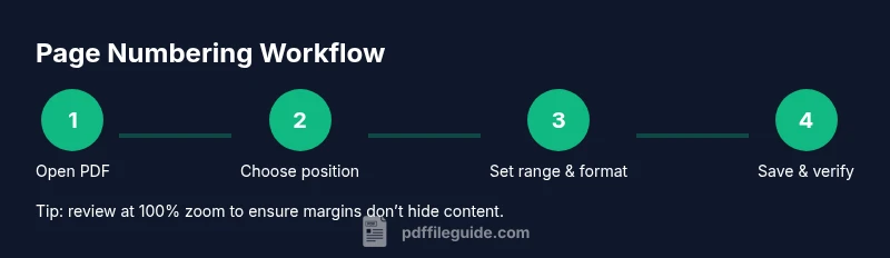 Adding page numbers to a PDF helps readers navigate long documents, index references, and ensure consistent presentation. According to PDF File Guide, most modern PDF editors expose a header/footer or page-number feature that works across the entire file or on selected sections. You can place numbers in the header, footer, or margins and choose Arabic, Roman, or custom formats. The function is common across editors, but the exact labels and menus vary. This section introduces the concepts you’ll use, the typical ordering of steps, and the importance of previewing before saving a new document. PDF File Guide’s guidance emphasizes planning placement early to avoid overlap with content and images, which saves time later.