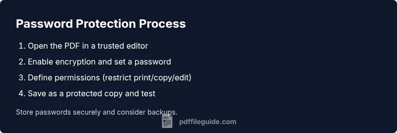Protect pdf with password is a practical, widely recommended safeguard for any document that contains sensitive information. According to PDF File Guide, password protection is a foundational step in reducing risk when you share PDFs with colleagues, clients, or customers. The approach is simple: you specify a password, and the PDF software encrypts the file so that only someone who knows the password can open it. In addition to opening restrictions, you can enforce permissions that limit printing, copying, or editing. The combination of password and permissions creates a layered defense that helps maintain confidentiality, integrity, and control over your content. This approach is especially important for documents containing personal data, financial details, or proprietary information. In professional settings, password protection helps ensure compliance with privacy regulations and internal data-handling policies. When used consistently, it becomes a reliable baseline security habit across teams and projects.