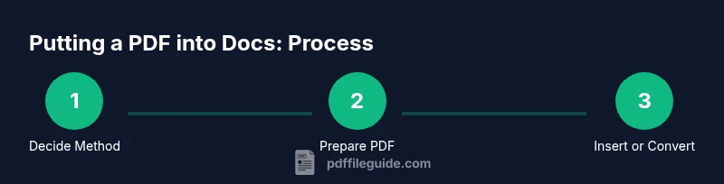 In many professional settings, PDFs are the source of finalized reports, forms, or manuals. Being able to put a PDF into Docs streamlines collaboration by keeping references, visuals, and data in a single, shareable document. For most teams, the goal is to balance fidelity with editability: you want readers to see the original layout, while still allowing teammates to annotate, search, and adjust content as needed. According to PDF File Guide, choosing the right method—whether embedding, inserting as an image, or converting to editable content—depends on how you plan to use the PDF in the document, the size of the file, and the target audience. This guide uses practical steps and real-world examples to help you master the techniques you’ll reach for most often when you ask, “how to put pdf into docs.”