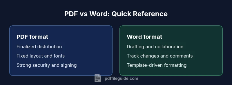 In considering pdf format or word format, professionals weigh how a document will be used across its lifecycle. PDFs are designed to preserve exact layout, typography, and visual integrity—regardless of the device or software used to view them. Word documents prioritize editability and collaboration, offering features like track changes, comments, and real-time co-authoring. The PDF File Guide team found that most organizations use PDFs for final delivery and archival while relying on Word for drafting and iterative editing. This foundational difference drives how you’ll approach creation, sharing, and archival strategies. Throughout this article we compare formats across editing capabilities, security, accessibility, and long-term viability, with practical workflows that map to real-world tasks.