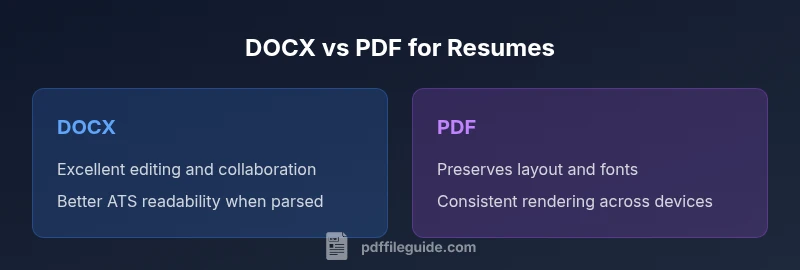 Choosing between DOCX and PDF for your resume is not merely an aesthetic decision. The format you select influences how recruiters view your document, how easily applicant tracking systems (ATS) extract your information, and how portable your resume is across devices and software. For job seekers, a careful choice can reduce the number of manual corrections and ensure your key achievements are visible in both human and automated reviews. As you assess your options, think about your workflow: do you need to tailor resumes often, or do you want a single, stand-alone version that looks identical to every reader? PDF File Guide notes that the ecosystem for resume formats is evolving, with better tagging and parsing for PDFs in recent years, but DOCX remains widely favored for iterative editing. The bottom line: understanding the trade-offs helps you present a professional, scalable resume.