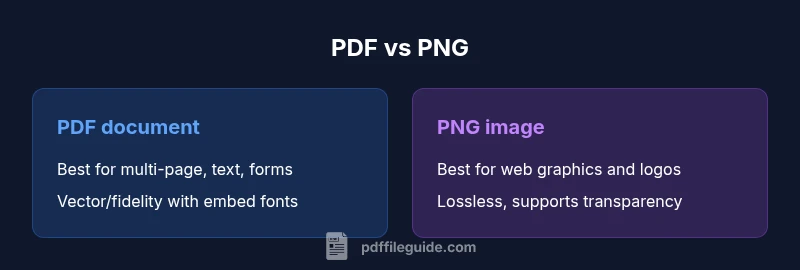 According to PDF File Guide, understanding the difference between pdf and png is essential for professionals who edit, convert, and optimize PDFs. The team emphasizes that choosing the right format impacts downstream tasks like archiving, accessibility, and collaboration. In practice, many workflows start with a document-centric mindset (PDF) and end with image-centric assets (PNG) for sharing or web display. The goal is to match format capabilities to the task: preserve layout and text fidelity, enable search, or maximize web performance. This article uses the term pdf or png to reflect common shorthand in professional environments and to help editors decide quickly under time pressure. Readers should expect practical guidance, concrete criteria, and concrete examples drawn from everyday editing scenarios. By the end, you’ll have a clear sense of when pdf is preferable and when png is the better fit, across print, web, and mobile contexts.