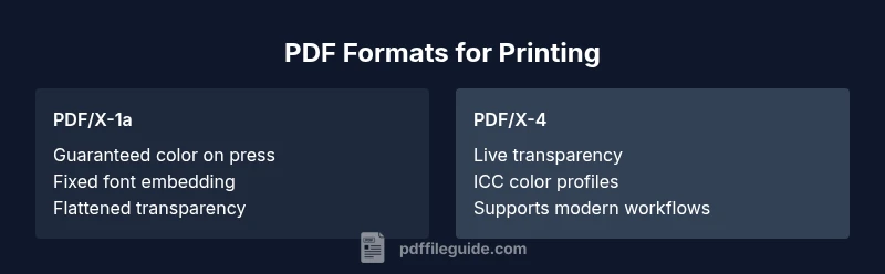 Why PDF format choice matters for print\n\nChoosing the right PDF format is more than a file preference; it shapes color accuracy, font fidelity, and page layout in the final print. For professionals, the question which pdf format is best for printing becomes a workflow decision: what the printer accepts, how prepress handles color, and whether you need long-term accessibility. According to PDF File Guide, aligning file settings with the downstream press requirements reduces reprints and speeds production. The goal is a predictable, reproduceable result across devices and print shops. In this section, we establish the basic principles behind print-ready PDFs and set up the criteria used throughout the comparison.\n\nA print-ready PDF should carry embedded fonts, consistent color intent, correct bleed, and appropriate compression. If you export a file with missing fonts or mismatched color profiles, the printer may substitute fonts or adjust colors, leading to unwanted shifts. The PDF format you choose should reflect your audience, whether it’s a professional offset press, a high-end digital printer, or a quick-turn desktop workflow. This article uses practical examples to illustrate how format choices affect outcomes at different scales and budgets, so you can pick confidently.