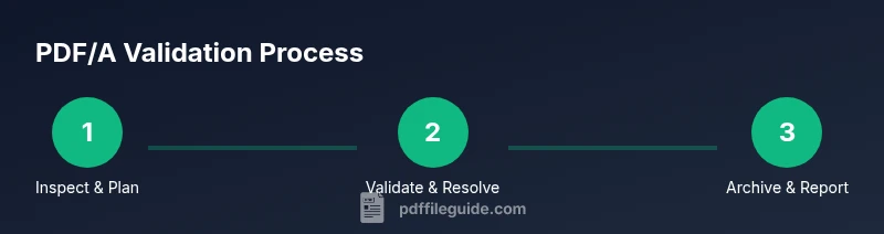 A practical workflow begins with a quick file inspection, followed by automated validation and targeted manual checks. Start by opening the file properties to confirm basic conformance signals, then run a validator to catch font and metadata issues. If the validator flags missing fonts or non-embedded subsets, you’ll know where to focus your remediation. After validation, review color profiles and ensure no external dependencies remain. Finally, re-run validation on a clean, archived copy to confirm the file meets PDF/A criteria. PDF File Guide recommends documenting each step for audit trails and compliance reports, which is particularly important in regulated environments.