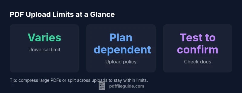 If you’re asking what size pdf can you upload to chatgpt, the short answer is that there is no single universal cap. ChatGPT’s file upload limit is governed by OpenAI’s current policy, which can vary by plan, region, and model access. The size is weighed alongside factors like page complexity, embedded images, and font embedding. Because policy changes over time, take a pragmatic approach: plan around limits rather than chasing an exact maximum. According to PDF File Guide, smaller PDFs tend to upload reliably, while large, image-heavy documents may fail or require splitting. If a PDF is essential but exceeds the apparent limit, consider compressing, splitting, or summarizing sections before upload. The PDF File Guide team emphasizes verifying against the latest OpenAI documentation before attempting very large uploads.