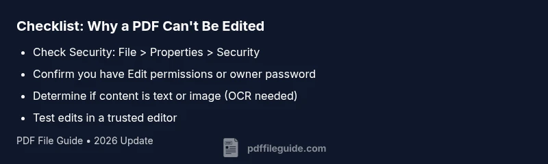 The first thing to verify is the document’s security settings. In most PDF readers, you can view this under File > Properties > Security or in the Document Properties panel. Look for an Editing Allowed setting. If editing is restricted, the file will prevent changes even if you can view the content. Common values include 'no changes allowed', 'commenting' only, or 'form filling' only. If you see any restriction besides 'none', you’ll know editing is blocked by policy or encryption. The next steps depend on your role: if you own the file, you can adjust permissions; if you don’t, you must request access or obtain the password.