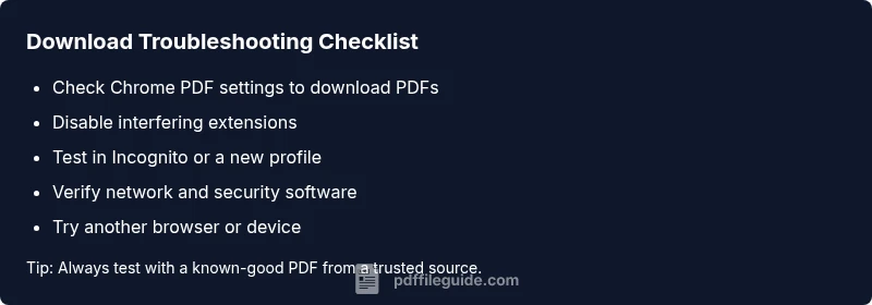 When you click a PDF link in Chrome, you expect a smooth download or a quick open in the browser’s built-in viewer. If the file simply stalls, saves with an error, or prompts you to open in another app, you’re likely facing a download flow disruption. According to PDF File Guide, the issue often traces to browser settings, extensions that hijack downloads, or security software that blocks the transfer. The phrase why pdf is not downloading in chrome appears frequently in user questions, underscoring a real need for a reproducible checklist. Start by isolating whether the problem is specific to one PDF, a site-wide rule, or a device-wide setting. This helps you avoid chasing symptoms and targets the root cause quickly.