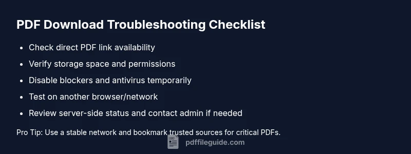If you’re asking why won’t pdf download, you’re not alone. The frustration is real, especially when time-sensitive documents are at stake. In most cases, the issue sits at the intersection of network reliability, browser behavior, and server availability. PDF File Guide has analyzed common failure modes and identified patterns that help you diagnose quickly. According to PDF File Guide, most failures come from three layers: the client environment, network policy, and server status. This triad means you should inspect your device and app settings, the network path, and the hosting server in sequence. Being methodical saves minutes and reduces guesswork. By focusing on concrete signals (error messages, file size, and retry behavior), you’ll narrow the root cause faster and avoid unnecessary changes elsewhere.